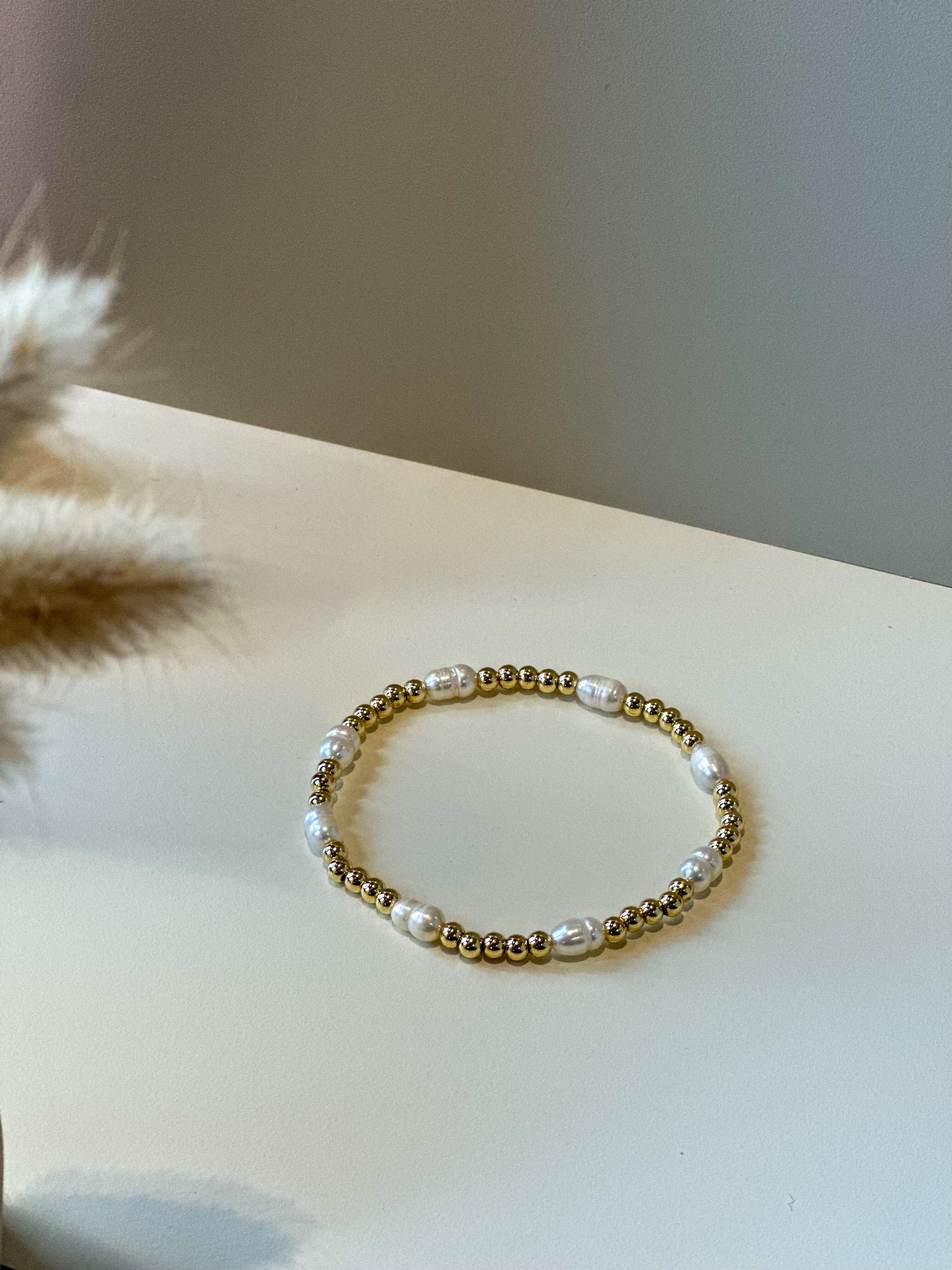 Deze armband is gemaakt met 14k gold filled 4mm beads en 4/5mm rijst shaped prachtige zoetwater pareltjes. Deze blijven onwijs mooi en verkleuren niet.